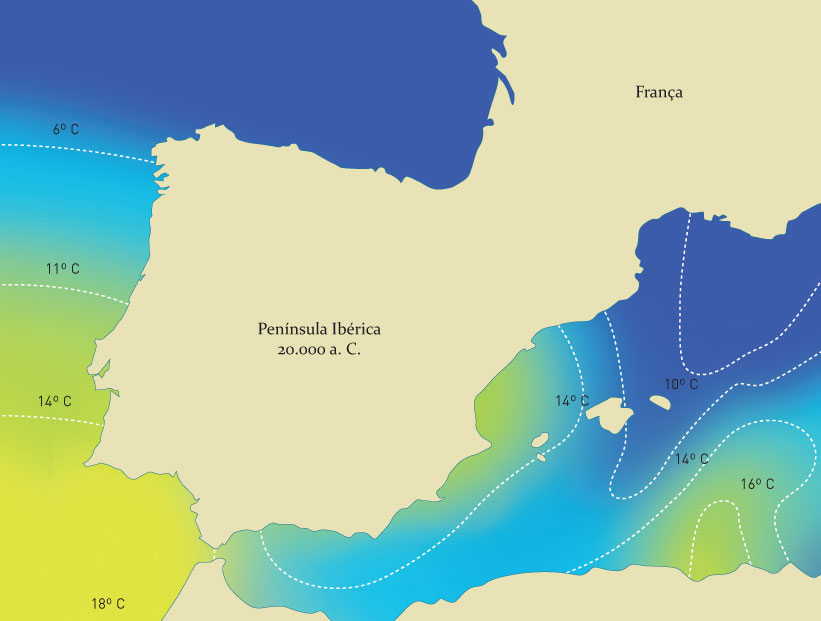 Durante a glaciação de há 20.000 anos, devido ao congelamento da água, o nível do mar estava 110 m mais baixo do que hoje. As serras da Península Ibérica, tais como os Pirenéus, os Montes Cantábricos, a Serra Nevada até Múrcia, e também a Serra da Estrela até Valência, tinham glaciares. O clima no interior da Península Ibérica apresentava traços continentais, enquanto as orlas marítimas se caracterizavam por variações térmicas mais temperadas. As regiões costeiras do Mediterrâneo e a costa sul do Atlântico apresentavam, devido à temperatura da água, um clima mais favorável a uma vegetação termófila.