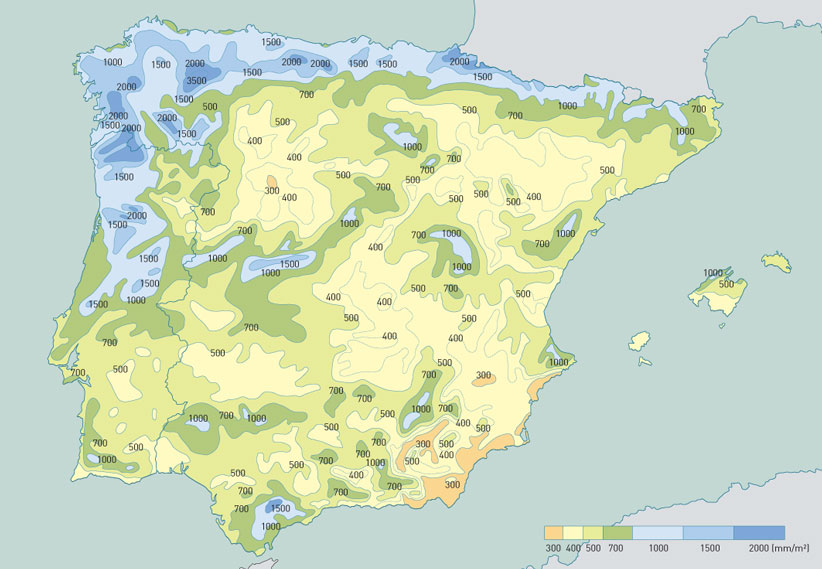 En la figura 12 se incluye la distribución de la precipitación media anual en la Península Ibérica. Si comparamos este mapa con el de la distribución de las Denominaciones de Origen (Fig. 3 – capítulo anterior), se observa que la isohieta de 700 mm es un buen límite superior para la justificación de la distribución del viñedo de calidad, aunque la relación no es tan determinante como en el caso de la insolación‑temperatura; el límite inferior no es significativo debido principalmente a que las condiciones hídricas limitantes son más fáciles de solucionar.